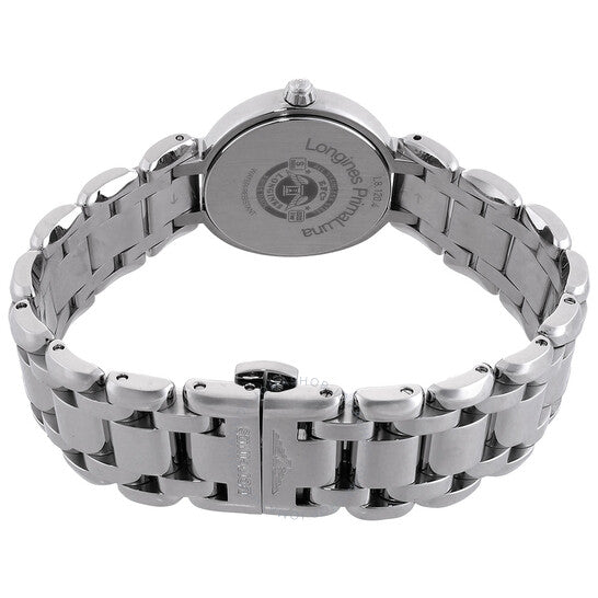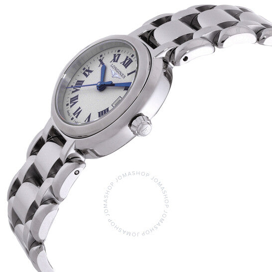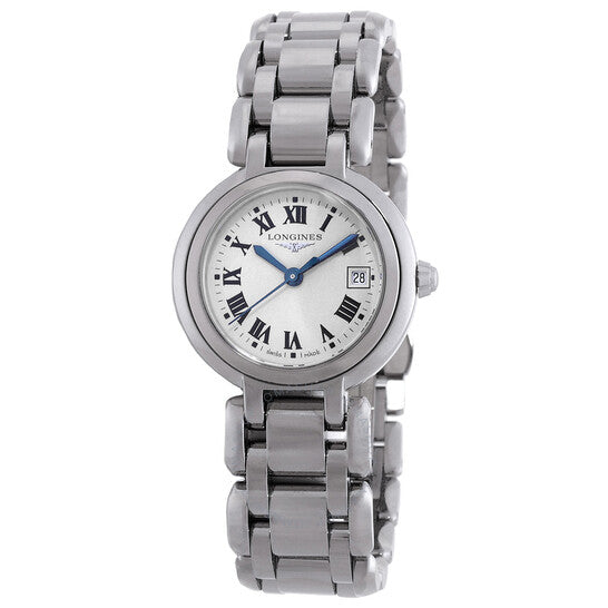 علبة وسوار من الفولاذ المقاوم للصدأ فضي اللون. إطار ثابت من الفولاذ المقاوم للصدأ فضي اللون. ميناء فضي بعقارب زرقاء وعلامات ساعات رومانية. علامات دقائق حول الحافة الخارجية. نوع الميناء: تناظري. عرض التاريخ عند موضع الساعة 3. حركة كوارتز لونجين كاليبر L250. زجاج ياقوت مقاوم للخدش. تاج قابل للسحب/الدفع. غطاء خلفي صلب. شكل دائري، حجم العلبة: 26.5 مم. مقاومة للماء حتى عمق 30 مترًا / 100 قدم. الوظائف: التاريخ، الساعة، الدقائق، الثواني، مؤشر عمر البطارية. سلسلة بريمالونا. تصميم كاجوال. علامة الساعة: صناعة سويسرية. ساعة لونجين بريمالونا كوارتز نسائية بمينا فضي L8.120.4.71.6.