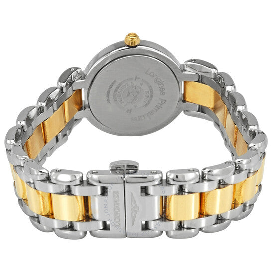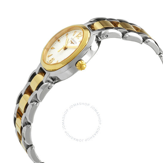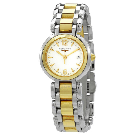 علبة من الفولاذ المقاوم للصدأ بسوار من الفولاذ المقاوم للصدأ ثنائي اللون (فضي اللون ومغطى بالذهب الأصفر عيار 18 قيراطًا). إطار ثابت فضي اللون ومغطى بالذهب الأصفر عيار 18 قيراطًا. ميناء أبيض بعقارب ومؤشرات ساعات من الذهب الأصفر. أرقام عربية عند موضعي الساعة 6 و12. مؤشرات دقائق حول الحافة الخارجية. نوع الميناء: تناظري. عرض التاريخ عند موضع الساعة 3. حركة كوارتز. كريستال ياقوت مقاوم للخدش. تاج قابل للسحب/الدفع. غطاء خلفي صلب. شكل دائري. حجم العلبة: 26.5 مم. مشبك قابل للطي. مقاومة للماء حتى عمق 30 مترًا / 100 قدم. الوظائف: التاريخ، الساعة، الدقيقة، الثانية. سلسلة بريمالونا. طراز ساعة رسمية. علامة الساعة: صناعة سويسرية. ساعة لونجين بريمالونا كوارتز نسائية بمينا بيضاء L8.110.5.90.6.