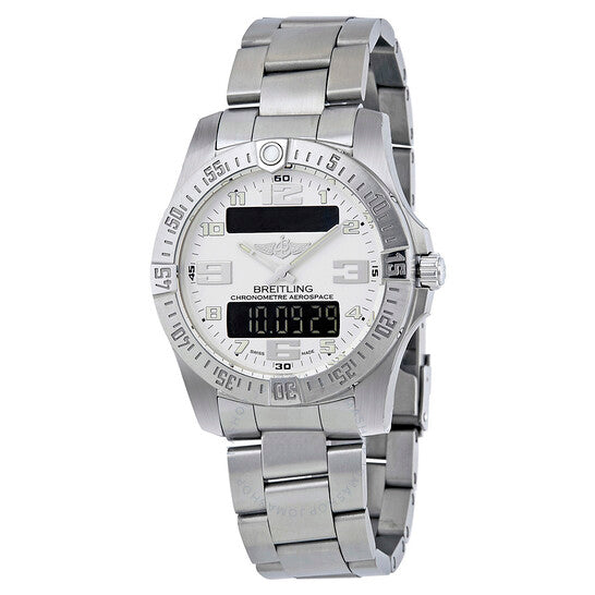 علبة من التيتانيوم الرمادي مع سوار من التيتانيوم الرمادي. إطار دوار أحادي الاتجاه من التيتانيوم الرمادي. ميناء فضي مع عقارب فضية مضيئة وعلامات ساعات بأرقام عربية. علامات دقائق حول الحافة الخارجية. نوع الميناء: تناظري-رقمي. عقارب وعلامات مضيئة. تقويم دائم. رقمي - كرونوغراف وتاريخ. حركة كوارتز بريتلينغ كاليبر 79. كريستال ياقوت مقاوم للخدش. تاج قابل للسحب/الدفع. غطاء خلفي صلب. شكل دائري، حجم العلبة: 43 مم، سمكها: 10.8 مم. عرض السوار: 22 مم / 20 مم. مشبك قابل للطي. مقاومة للماء حتى عمق 100 متر / 330 قدم. الوظائف: الساعات، الدقائق، الثواني، التقويم الدائم، مؤقت تنازلي، توقيت غرينتش، منبه، إضاءة خلفية. سلسلة إيروسبيس الاحترافية. طراز ساعة رياضية. ملصق الساعة: صناعة سويسرية. ساعة بريتلينغ بروفيشنال إيروسبيس إيفو للرجال E793637V-G817.