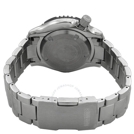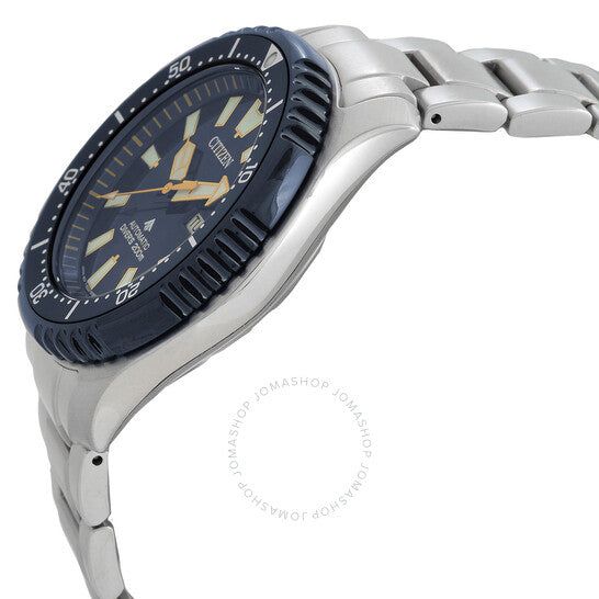 علبة وسوار من الفولاذ المقاوم للصدأ فضي اللون. إطار من الفولاذ المقاوم للصدأ أزرق اللون. ميناء أزرق اللون مع عقارب وعلامات ساعات ذهبية اللون. علامات دقائق حول الحافة الخارجية. نوع الميناء: تناظري. عقارب وعلامات مضيئة. عرض يوم الأسبوع والتاريخ عند موضع الساعة 3. حركة أوتوماتيكية عيار 8204. زجاج معدني مقاوم للخدش. تاج لولبي. هيكل دائري الشكل، مقاسه: 42 مم، سُمكه: 12.8 مم. مقاوم للماء حتى عمق 200 متر / 660 قدمًا. سلسلة بروماستر. ساعة رسمية. ساعة سيتيزن بروماستر أوتوماتيكية للرجال بمينا أزرق NY0166-60L.