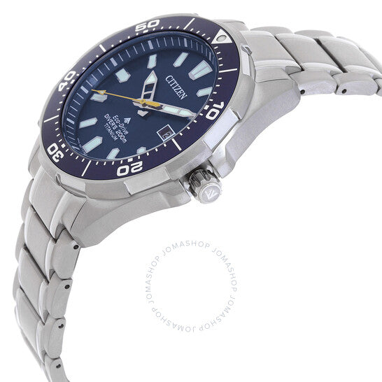 علبة وسوار من التيتانيوم فضي اللون. ميناء أزرق مع عقارب وعلامات ساعات فضية اللون. علامات دقائق حول الحافة الخارجية. نوع الميناء: تناظري. عقارب وعلامات مضيئة. عرض التاريخ عند موضع الساعة 3. حركة Citizen Caliber E168 eco-drive. تاج لولبي. غطاء خلفي صلب. شكل العلبة دائري، مقاسها 44 مم. مشبك قابل للطي. مقاومة للماء حتى عمق 200 متر / 660 قدم. الوظائف: التاريخ، الساعة، الدقائق، الثواني. سلسلة Promaster. ساعة Citizen Promaster للرجال بمينا أزرق BN0201-88L.