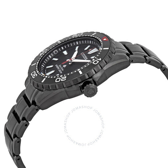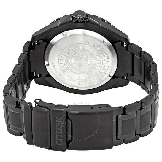 علبة وسوار من الفولاذ المقاوم للصدأ مطليان بالأيونات باللون الأسود. إطار ثابت مطلي بالأيونات باللون الأسود مع حلقة من الألومنيوم الأسود. ميناء أسود بعقارب ومؤشرات ساعات فضية مضيئة. مؤشرات دقائق حول الحافة الخارجية. نوع الميناء: تناظري. عقارب ومؤشرات مضيئة. عرض التاريخ عند موضع الساعة 3. حركة Citizen Caliber Eco-Drive E168 eco-drive. زجاج معدني مقاوم للخدش. غطاء خلفي صلب. شكل دائري. حجم العلبة: 45 مم. سمكها: 12 مم. عرض السوار: 20 مم. مشبك أمان قابل للطي مع زر ضغط للفتح. مقاومة للماء حتى عمق 200 متر / 660 قدمًا. الوظائف: التاريخ، الساعات، الدقائق، الثواني، تعمل بالطاقة الشمسية. تصميم ساعة كاجوال. علامة الساعة: Japan Movt. ساعة Citizen Promaster Diver Eco-Drive للرجال بمينا أسود BN0195-54E.