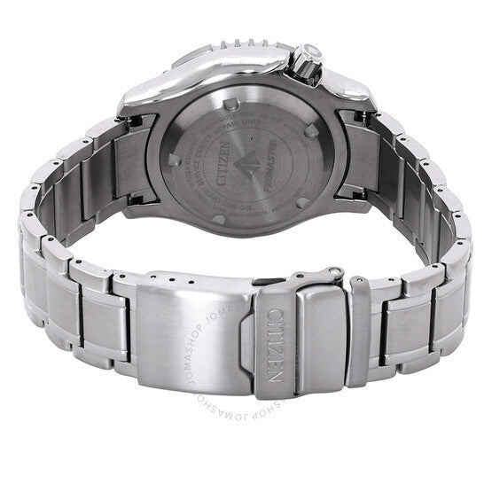 علبة وسوار من الفولاذ المقاوم للصدأ فضي اللون. إطار دوار أحادي الاتجاه من الفولاذ المقاوم للصدأ أسود اللون. ميناء أزرق مع عقارب فضية اللون وعلامات ساعات منقطة. علامات دقائق حول الحافة الخارجية. نوع الميناء: تناظري. عقارب وعلامات مضيئة. عرض اليوم والتاريخ عند موضع الساعة 3. حركة أوتوماتيكية من سيتيزن كاليبر 8204 مع احتياطي طاقة لمدة 45 ساعة. زجاج معدني مقاوم للخدش. تاج لولبي. غطاء خلفي صلب. شكل دائري، مقاس العلبة: 42 مم، سمكها: 13.5 مم. عرض السوار: 20 مم. مشبك قابل للطي مع مفتاح أمان. مقاومة للماء حتى عمق 200 متر / 660 قدمًا. الوظائف: التاريخ، اليوم، الساعة، الدقيقة، الثانية. سلسلة بروماستر. طراز ساعة الغوص. ملصق الساعة: Japan Movt. ساعة سيتيزن بروماستر أوتوماتيكية للرجال بمينا أزرق NY0100-50M.