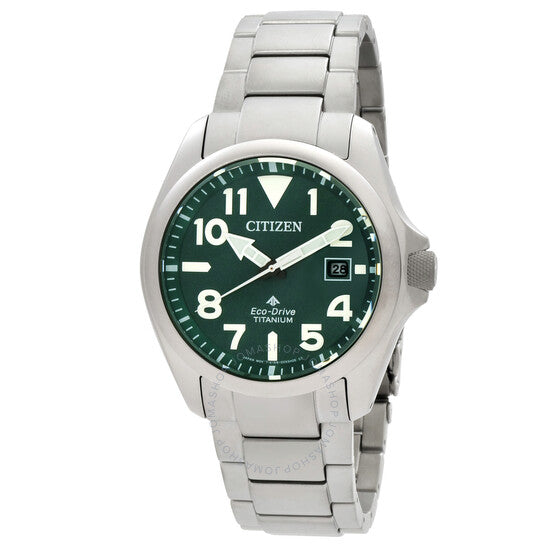 علبة وسوار من التيتانيوم الفائق فضي اللون. إطار ثابت من التيتانيوم الفائق فضي اللون. ميناء أخضر بعقارب فضية اللون وعلامات ساعات بأرقام عربية. علامات دقائق حول الحافة الخارجية. نوع الميناء: تناظري. عقارب وعلامات مضيئة. عرض التاريخ عند موضع الساعة 3. حركة سيتيزن كاليبر إيكو-درايف E168 إيكو-درايف. كريستال ياقوت مقاوم للخدش. تاج لولبي. غطاء خلفي صلب. هيكل دائري الشكل، مقاسه 41 مم. مشبك قابل للطي مع مفتاح أمان. مقاومة للماء حتى عمق 200 متر / 660 قدم. الوظائف: التاريخ، الساعات، الدقائق، الثواني، تعمل بالطاقة الشمسية. سلسلة بروماستر تاف. تصميم كاجوال. علامة الساعة: Japan Movt. ساعة سيتيزن بروماستر تاف إيكو-درايف للرجال بمينا أخضر BN0241-59W.