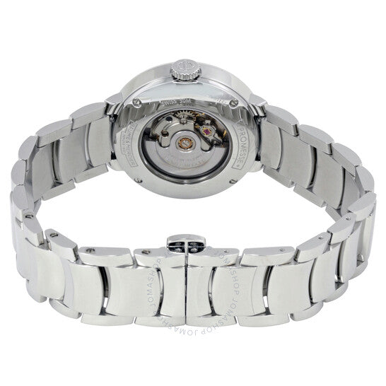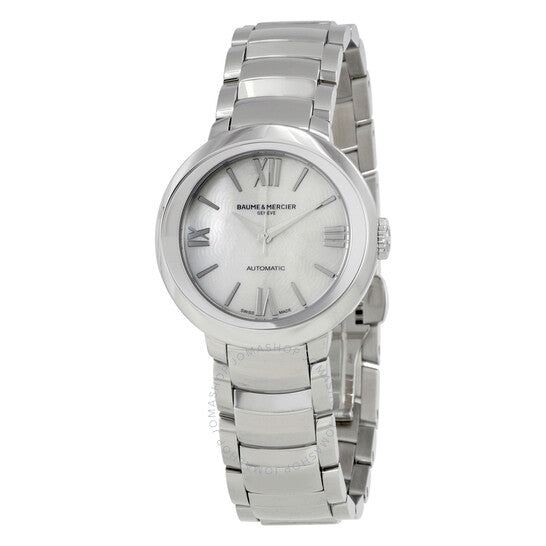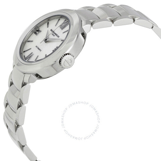 علبة من الفولاذ المقاوم للصدأ مع سوار من الفولاذ المقاوم للصدأ. إطار ثابت من الفولاذ المقاوم للصدأ. ميناء أبيض من عرق اللؤلؤ مع عقارب فضية اللون على شكل دوفين وعلامات ساعات. أرقام رومانية تُشير إلى مواقع الساعات 3 و6 و9 و12. نوع الميناء: تناظري. حركة أوتوماتيكية من عيار ETA 2671 مع احتياطي طاقة لمدة 38 ساعة. زجاج ياقوت مقاوم للخدش. تاج قابل للسحب/الدفع. غطاء خلفي شفاف. شكل دائري. حجم العلبة: 30 مم. سمكها: 9.8 مم. مشبك قابل للطي. مقاومة للماء حتى عمق 50 مترًا / 165 قدمًا. الوظائف: الساعات، الدقائق، الثواني. تصميم ساعة فاخرة. علامة الساعة: صناعة سويسرية. إصدارات المنتج: MOA10182، M0A10182، 10182. ساعة بوم إيه ميرسييه بروميس أوتوماتيكية نسائية 10182.