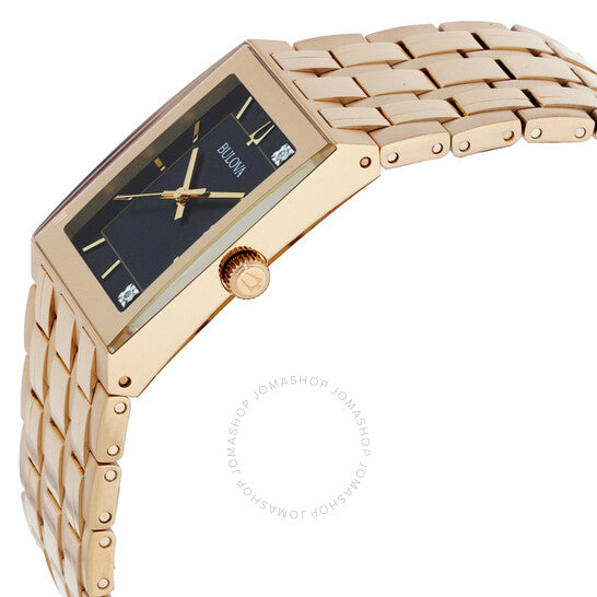 علبة وسوار من الفولاذ المقاوم للصدأ ذهبي اللون. إطار ثابت من الفولاذ المقاوم للصدأ ذهبي اللون. ميناء أسود بعقارب فضية اللون وعلامات ساعات مرصعة بالألماس. نوع الميناء: تناظري. حركة كوارتز بولوفا كاليبر 2036. كريستال معدني منحني مقاوم للخدش. غطاء خلفي صلب. شكل العلبة مربع، مقاسها 30 مم. مشبك قابل للطي بزر ضغط. مقاومة للماء حتى عمق 30 مترًا / 100 قدم. الوظائف: الساعات، الدقائق، الثواني. سلسلة كوادرا. ساعة كاجوال أنيقة. ساعة بولوفا كوادرا كوارتز نسائية بمينا أسود مرصعة بالألماس، رقم 97D132.