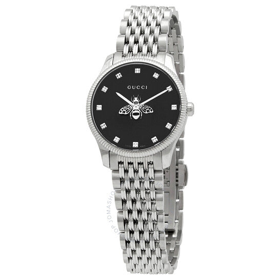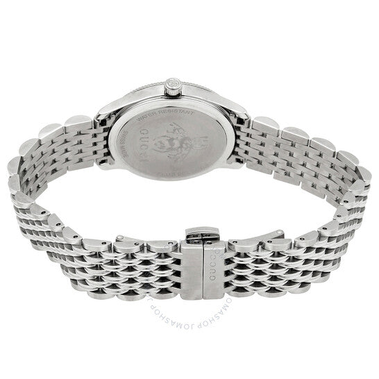 علبة من الفولاذ المقاوم للصدأ مع سوار من الفولاذ المقاوم للصدأ. إطار ثابت من الفولاذ المقاوم للصدأ. ميناء أسود (على شكل نحلة) بعقارب فضية اللون وعلامات ساعات. نوع الميناء: تناظري. حركة كوارتز عيار ETA F04.105. زجاج ياقوت مقاوم للخدش. تاج قابل للسحب/الدفع. غطاء خلفي صلب. شكل دائري. حجم العلبة: 29 مم. سمكها: 8 مم. عرض السوار: 14 مم. مشبك قابل للطي بزر ضغط. مقاومة للماء حتى عمق 50 مترًا / 165 قدمًا. الوظائف: الساعات، الدقائق. سلسلة G-timeless. طراز ساعة رسمية. علامة الساعة: صناعة سويسرية. ساعة غوتشي كوارتز نسائية بمينا سوداء YA1265020.