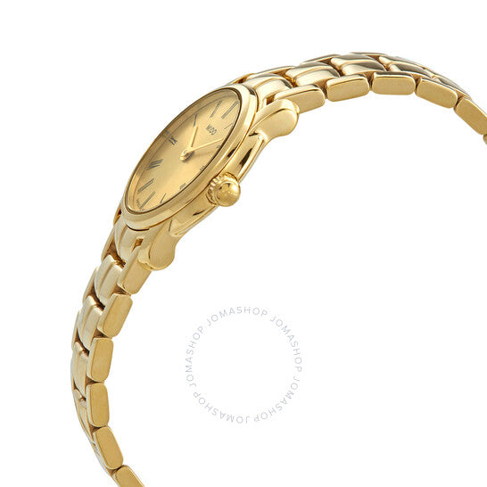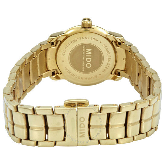 علبة وسوار من الفولاذ المقاوم للصدأ ذهبي اللون. إطار ذهبي ثابت. ميناء بلون الشمبانيا مع عقارب ذهبية اللون وعلامات ساعات بأرقام رومانية. نوع الميناء: تناظري. حركة كوارتز. زجاج ياقوت مقاوم للخدش. تاج قابل للسحب/الدفع. غطاء خلفي صلب. شكل دائري. حجم العلبة: ٢٦ مم. مشبك قابل للطي بزر ضغط. مقاومة للماء حتى عمق ٣٠ مترًا / ١٠٠ قدم. الوظائف: الساعات، الدقائق. طراز ساعة رسمية. علامة الساعة: صناعة سويسرية. ساعة ميدو كوارتز نسائية بمينا بلون الشمبانيا، موديل M7445.3.22.1.