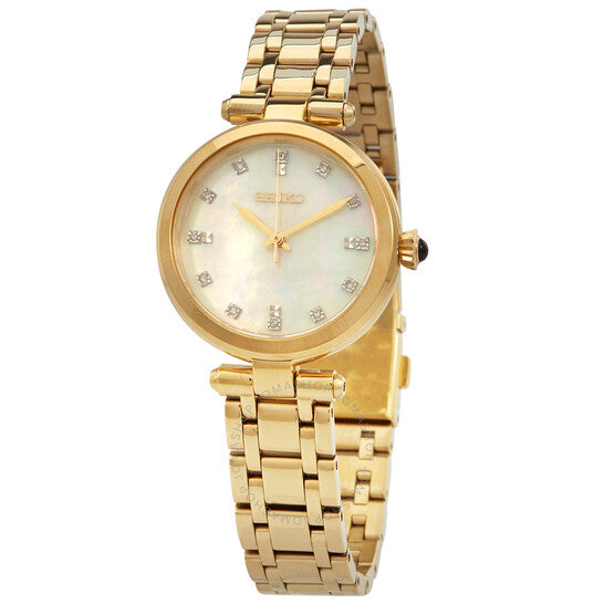 علبة وسوار من الفولاذ المقاوم للصدأ ذهبي اللون. إطار ذهبي ثابت. ميناء أبيض بعقارب ذهبية اللون وعلامات ساعات من الكريستال. نوع الميناء: تناظري. حركة كوارتز سيكو عيار 7N01. زجاج ياقوت مقاوم للخدش. تاج قابل للسحب/الدفع. غطاء خلفي صلب. شكل دائري. حجم العلبة: 30 مم. سمكها: 6.3 مم. عرض السوار: 13 مم. مشبك قابل للطي مع مفتاح أمان. مقاومة للماء حتى عمق 50 مترًا / 165 قدمًا. الوظائف: الساعات، الدقائق، الثواني. طراز ساعة رسمية. اسم الساعة: Japan Movt. ساعة سيكو كوارتز كريستالية نسائية بمينا بيضاء SRZ536P1.