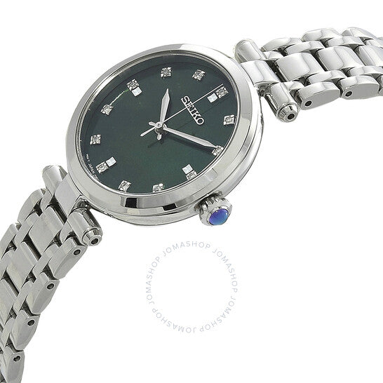 علبة وسوار من الفولاذ المقاوم للصدأ فضي اللون. إطار ثابت من الفولاذ المقاوم للصدأ فضي اللون. ميناء أخضر بعقارب فضية اللون وعلامات ساعات من الألماس. نوع الميناء: تناظري. حركة كوارتز. زجاج ياقوت مقاوم للخدش. تاج قابل للسحب/الدفع. غطاء خلفي صلب. شكل العلبة دائري، مقاسها: 30 مم، سمكها: 6.5 مم. عرض السوار: 13 مم. مشبك قابل للطي بزر ضغط. مقاومة للماء حتى عمق 30 مترًا / 100 قدم. الوظائف: الساعات، الدقائق، الثواني. طراز الساعة الرياضية. اسم الساعة: Japan Movt. ساعة سيكو كوارتز نسائية مرصعة بالألماس، SRZ535P1.