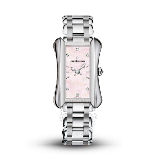 علبة وسوار من الفولاذ المقاوم للصدأ فضي اللون. إطار ثابت من الفولاذ المقاوم للصدأ فضي اللون. ميناء وردي من عرق اللؤلؤ مع عقارب فضية اللون وعلامات ساعات مرصعة بالألماس. نوع الميناء: تناظري. حركة كوارتز كارل إف. بوخرر كاليبر CFB 1850. زجاج ياقوت مقاوم للخدش. غطاء خلفي صلب. شكل فريد للعلبة، مقاسها: 26.50 × 38 مم. مشبك قابل للطي. مقاومة للماء حتى عمق 30 مترًا / 100 قدم. الوظائف: الساعات، الدقائق. سلسلة ألاكريا كوين. طراز ساعة الغوص. علامة الساعة: صناعة سويسرية. ساعة كارل إف. بوخرر كوارتز نسائية مرصعة بالألماس 00.10701.08.77.21.