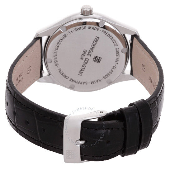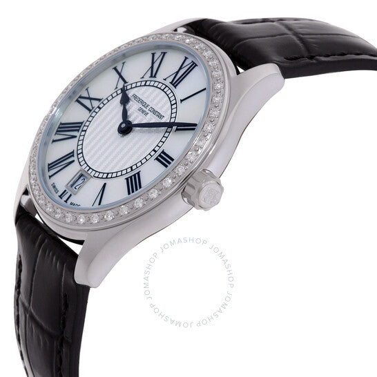 علبة من الفولاذ المقاوم للصدأ فضية اللون مع سوار جلدي أسود. إطار فضي اللون مرصع بالألماس. ميناء أبيض بعقارب سوداء وعلامات ساعات رومانية. نوع الميناء: تناظري. عرض التاريخ عند موضع الساعة السادسة. حركة كوارتز. زجاج ياقوتي مقاوم للخدش. غطاء خلفي صلب. شكل العلبة دائري، مقاسها: 36 مم. مشبك بإبزيم دبوسي. مقاومة للماء حتى عمق 30 مترًا / 100 قدم. الوظائف: التاريخ، الساعة، الدقائق، الثانية. طراز ساعة رسمية. علامة الساعة: صناعة سويسرية. ساعة فريدريك كونستانت كوارتز نسائية بمينا بيضاء مرصعة بالألماس، FC-220MPW3BD6.