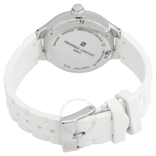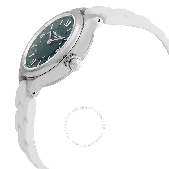 علبة من الفولاذ المقاوم للصدأ مع سوار بلاستيكي أبيض. إطار ثابت من الفولاذ المقاوم للصدأ. ميناء أخضر بعقارب فضية اللون وعلامات ساعات. أرقام رومانية عند مواضع الساعة 3 و6 و9 و12. علامات دقائق حول الحافة الخارجية. نوع الميناء: تناظري. كرونوغراف - ثلاثة أقراص فرعية تعرض: 60 ثانية، 30 دقيقة، و12 ساعة. حركة كوارتز. زجاج ياقوت مقاوم للخدش. تاج قابل للسحب/الدفع. غطاء خلفي صلب. شكل دائري. حجم العلبة: 34 مم. سمكها: 11 مم. عرض السوار: 15 مم. مشبك تانغ. مقاومة للماء حتى عمق 30 مترًا / 100 قدم. الوظائف: ساعة، دقيقة. تصميم كاجوال. علامة الساعة: صناعة سويسرية. ساعة فريدريك كونستانت كوارتز ذكية نسائية بمينا أخضر، FC-281GRH3ER6.