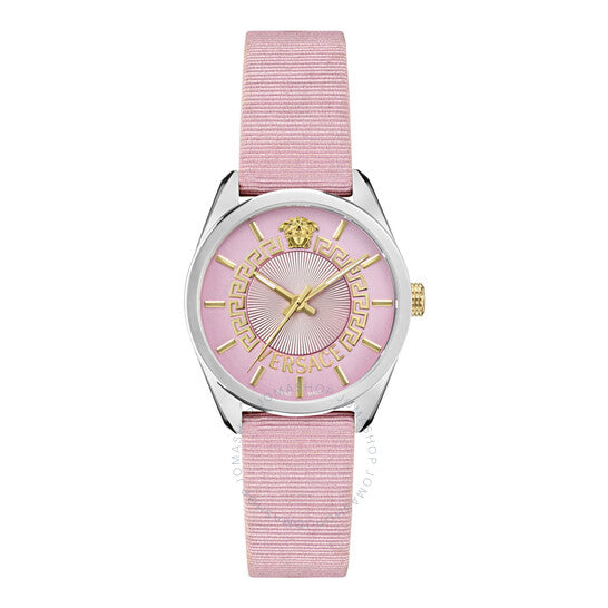 علبة من الفولاذ المقاوم للصدأ فضية اللون مع سوار وردي من الحرير المضلع. إطار ثابت من الفولاذ المقاوم للصدأ فضي اللون. ميناء وردي مزخرف بنقش غيوشيه مع عقارب ذهبية اللون وعلامات ساعات. نوع الميناء: تناظري. حركة كوارتز. زجاج ياقوت مقاوم للخدش. تاج قابل للسحب/الدفع. غطاء خلفي صلب. شكل دائري، مقاس العلبة: 36 مم. مشبك تانغ. مقاومة للماء حتى عمق 50 مترًا / 165 قدمًا. الوظائف: الساعات، الدقائق، الثواني. طراز ساعة رسمية. علامة الساعة: صناعة سويسرية. ساعة فيرساتشي كوارتز نسائية بمينا غيوشيه وردي VE8A00124.