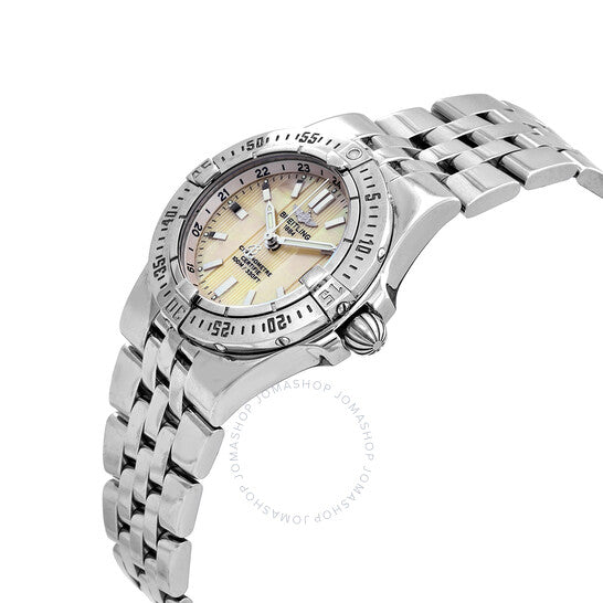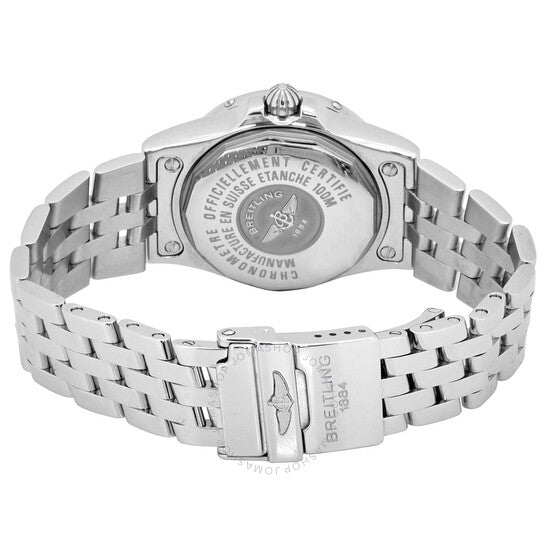 علبة وسوار من الفولاذ المقاوم للصدأ فضي اللون. إطار ثابت من الفولاذ المقاوم للصدأ. ميناء من عرق اللؤلؤ مع عقارب وعلامات ساعات فضية اللون. علامات دقائق حول الحافة الخارجية. نوع الميناء: تناظري. عرض التاريخ عند موضع الساعة 3. حركة كوارتز. زجاج ياقوتي مقاوم للخدش. علبة دائرية الشكل، مقاسها: 30 مم، سُمكها: 12.2 مم. مقاومة للماء حتى عمق 100 متر / 330 قدمًا. الوظائف: التاريخ، الساعة، الدقائق، الثواني. تصميم ساعة فاخر. علامة الساعة: صناعة سويسرية. ساعة بريتلينغ كوارتز نسائية A7134012/I508.368A.
