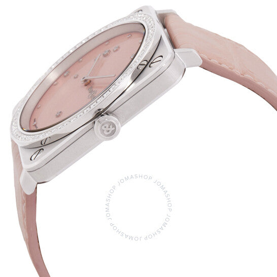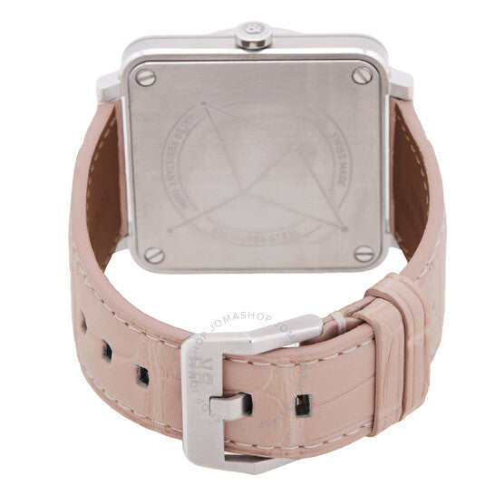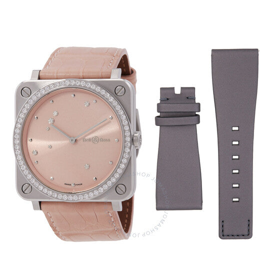 علبة فضية اللون من الفولاذ المقاوم للصدأ مع سوار وردي من جلد التمساح. إطار ثابت من الفولاذ المقاوم للصدأ. ميناء وردي بنقشة أشعة الشمس مع عقارب فضية اللون. نوع الميناء: تناظري. حركة كوارتز من بيل آند روس، عيار BR-CAL.102. زجاج من الياقوت المقاوم للخدش. تاج قابل للسحب/الدفع. غطاء خلفي صلب. شكل العلبة مربع، مقاسها: 39 مم × 39 مم. مشبك بإبزيم. مقاومة للماء حتى عمق 100 متر / 330 قدمًا. الوظائف: الساعات، الدقائق. معلومات إضافية: إطار مرصع بـ 66 حجرًا كريمًا (0.99 قيراط). طراز ساعة فاخر. علامة الساعة: صناعة سويسرية. ساعة بيل آند روس كوارتز نسائية BRS-EP-ST-LGD/SCR.