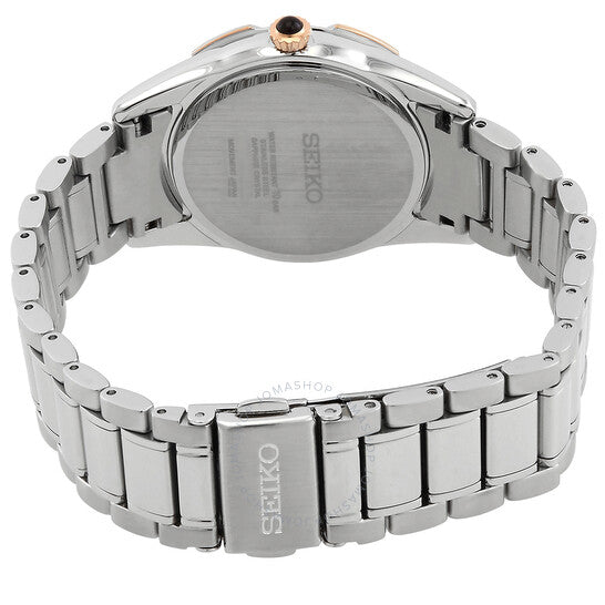 علبة وسوار من الفولاذ المقاوم للصدأ فضي اللون. إطار ثابت من الفولاذ المقاوم للصدأ فضي اللون. ميناء من عرق اللؤلؤ مع عقارب ذهبية اللون وعلامات ساعات. نوع الميناء: تناظري. عرض التاريخ عند موضع الساعة 3. حركة كوارتز سيكو عيار 7N32. كريستال ياقوت مقاوم للخدش. تاج قابل للسحب/الدفع. غطاء خلفي صلب. شكل العلبة دائري، مقاسها: 33.2 مم، سمكها: 7.2 مم. عرض السوار: 17 مم. مشبك قابل للطي مع مفتاح أمان. مقاومة للماء حتى عمق 100 متر / 330 قدمًا. الوظائف: التاريخ، الساعة، الدقائق، الثانية. طراز ساعة رسمية. ملصق الساعة: Japan Movt. ساعة سيكو كوارتز نسائية بمينا من عرق اللؤلؤ SKK730P1.