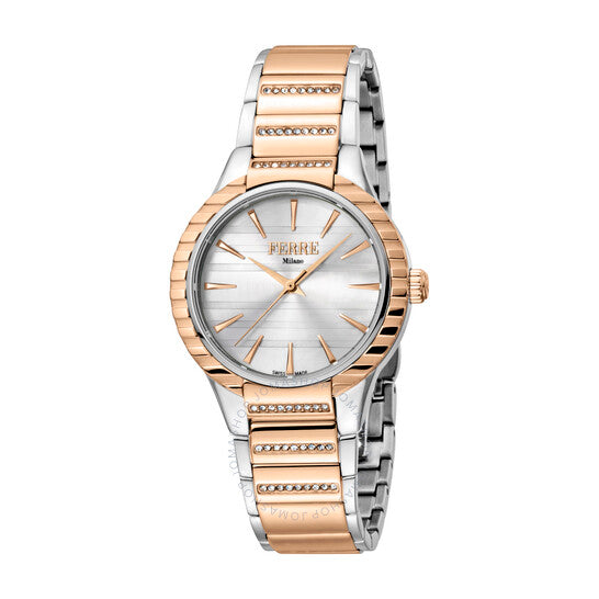 علبة من الفولاذ المقاوم للصدأ فضية اللون مع سوار من الفولاذ المقاوم للصدأ ثنائي اللون. إطار ثابت بلون الذهب الوردي. ميناء فضي اللون مع عقارب ومؤشرات ساعات ذهبية اللون. نوع الميناء: تناظري. حركة كوارتز. زجاج معدني مقاوم للخدش. تاج قابل للسحب/الدفع. غطاء خلفي صلب. شكل دائري، مقاس العلبة: 32 مم، سمكها: 7 مم. عرض السوار: 16 مم، طوله: 7 بوصات. مشبك قابل للطي بزر ضغط. مقاومة للماء حتى عمق 50 مترًا / 165 قدمًا. الوظائف: الساعات، الدقائق، الثواني. تصميم عصري. علامة الساعة: صناعة سويسرية. ساعة فيري ميلانو كوارتز نسائية بمينا فضية FM1L114M0101.