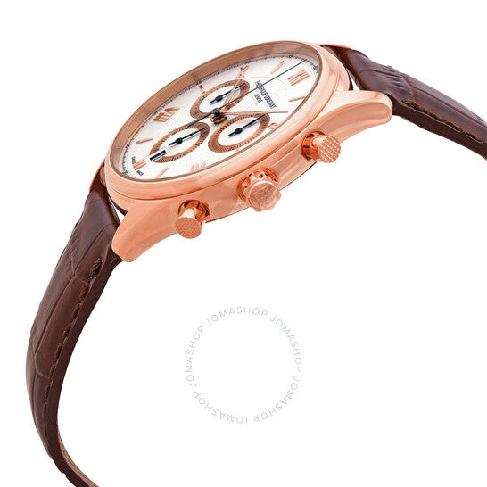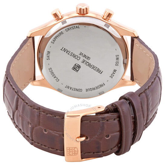 علبة من الفولاذ المقاوم للصدأ مطلية بالذهب الوردي مع سوار جلدي بني. إطار ثابت مطلي بالذهب الوردي. ميناء فضي بعقارب بلون الذهب الوردي وأرقام رومانية متناوبة وعلامات ساعات. علامات دقائق حول الحافة الخارجية. نوع الميناء: تناظري. عرض التاريخ عند موضع الساعة السادسة. كرونوغراف - ثلاثة أقراص فرعية تعرض: 60 ثانية، 30 دقيقة، و12 ساعة. حركة كوارتز عيار فريدريك كونستانت FC-292. كريستال ياقوت مقاوم للخدش. غطاء خلفي صلب. شكل دائري. حجم العلبة: 40 مم. سمكها: 10.2 مم. عرض السوار: 22 مم. مشبك تانغ. مقاومة للماء حتى عمق 50 مترًا / 165 قدمًا. الوظائف: التاريخ، الساعة، الدقيقة، الثانية. طراز الساعة الرياضية. علامة الساعة: صناعة سويسرية. ساعة فريدريك كونستانت كوارتز للرجال بمينا فضي FC-292MVG5B4.