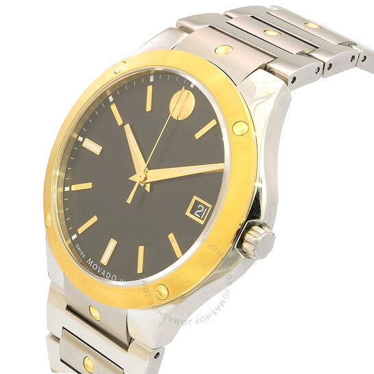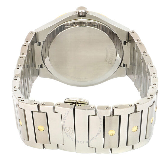 علبة من الفولاذ المقاوم للصدأ بلمسة نهائية مزدوجة، مطلية بالذهب الأصفر، ومُطعّمة بنقاط مقعرة مصقولة، وسوار من الفولاذ المقاوم للصدأ بلمسة نهائية ذهبية مصقولة بنقاط مقعرة مصقولة. ميناء أسود بنقش أشعة الشمس مع مؤشرات ساعات. نوع الميناء: تناظري. عقارب ومؤشرات مضيئة. نافذة لعرض التاريخ عند موضع الساعة الثالثة. آلية حركة كوارتز. زجاج ياقوتي مقاوم للخدش. هيكل دائري، مقاسه 41 مم. مقاومة للماء حتى عمق 50 مترًا / 165 قدمًا. علامة الساعة: صناعة سويسرية.