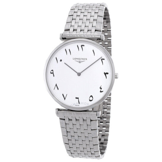 علبة وسوار من الفولاذ المقاوم للصدأ فضي اللون. إطار ثابت من الفولاذ المقاوم للصدأ فضي اللون. ميناء أبيض بعقارب سوداء وعلامات ساعات رقمية عربية. نوع الميناء: تناظري. حركة كوارتز. زجاج ياقوتي مقاوم للخدش. تاج قابل للسحب/الدفع. شكل العلبة دائري، مقاسها: 37 مم. مقاومة للماء حتى عمق 30 مترًا / 100 قدم. الوظائف: الساعات، الدقائق. طراز الساعة الرياضية. علامة الساعة: صناعة سويسرية. ساعة لونجين كوارتز رجالية بمينا بيضاء، طراز L47664136.