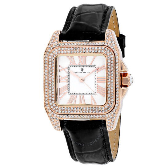 علبة من النحاس الأصفر بلون الذهب الوردي مرصعة بالكريستال، وسوار من الجلد الأسود. إطار ثابت من النحاس الأصفر بلون الذهب الوردي مرصع بالكريستال. ميناء أبيض بعقارب وعلامات ساعات ذهبية وردية. مقياس دقائق حول حلقة داخلية. نوع الميناء: تناظري. حركة كوارتز. كريستال معدني مقاوم للخدش. تاج قابل للسحب/الدفع. غطاء خلفي صلب. شكل العلبة مربع. حجم العلبة: ٢٩ مم. عرض السوار: ٢٠ مم. مشبك تانغ. مقاومة للماء حتى عمق ٣٠ مترًا / ١٠٠ قدم. الوظائف: الساعات، الدقائق، الثواني. سلسلة راديوز. ساعة كريستيان فان سانت راديوز كوارتز نسائية بمينا بيضاء CV4426.