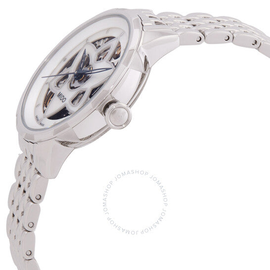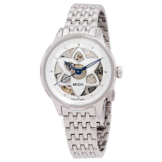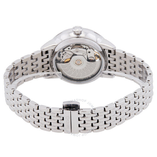 علبة وسوار من الفولاذ المقاوم للصدأ فضي اللون. إطار ثابت من الفولاذ المقاوم للصدأ فضي اللون. ميناء مفتوح من عرق اللؤلؤ مع عقارب زرقاء وعلامات ساعات. نوع الميناء: تناظري. حركة كوارتز من ميدو كاليبر 80. زجاج من الياقوت المقاوم للخدش. تاج قابل للسحب/الدفع. غطاء خلفي شفاف. شكل العلبة دائري، مقاسها: 34 مم، سمكها: 9.9 مم. عرض السوار: 15 مم. مشبك قابل للطي مع مفتاح أمان. مقاومة للماء حتى عمق 30 مترًا / 100 قدم. الوظائف: الساعات، الدقائق، الثواني. سلسلة زهور المطر. طراز ساعة رسمية. علامة الساعة: صناعة سويسرية. ساعة ميدو كوارتز نسائية من زهرة المطر M0432361110100.