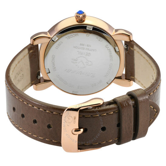 علبة من الفولاذ المقاوم للصدأ بلون الذهب الوردي مع سوار جلدي بني. إطار ثابت من الفولاذ المقاوم للصدأ بلون الذهب الوردي. ميناء من عرق اللؤلؤ مع عقارب بلون الذهب الوردي وأرقام عربية وعلامات ساعات. علامات دقائق حول الحافة الخارجية. نوع الميناء: تناظري. عقارب مضيئة. حركة كوارتز روندا كاليبر 762. زجاج ياقوت مقاوم للخدش. تاج قابل للسحب/الدفع. غطاء خلفي صلب. شكل دائري، حجم العلبة: 37 مم، سمكها: 8.5 مم. عرض السوار: 18 مم. مشبك بإبزيم. مقاومة للماء حتى عمق 50 مترًا / 165 قدمًا. الوظائف: الساعة، الدقائق. معلومات إضافية: 8 ماسات. سلسلة رافينا. تصميم عصري. علامة الساعة: سويسرية. ساعة رافينا GV2 من جيفريل، بمينا من عرق اللؤلؤ، للنساء، 12611.