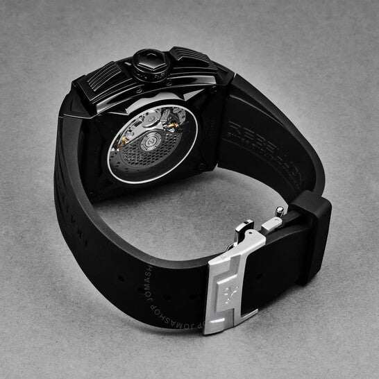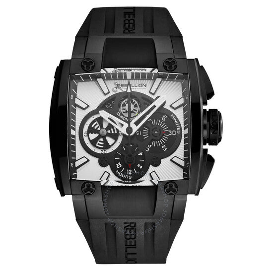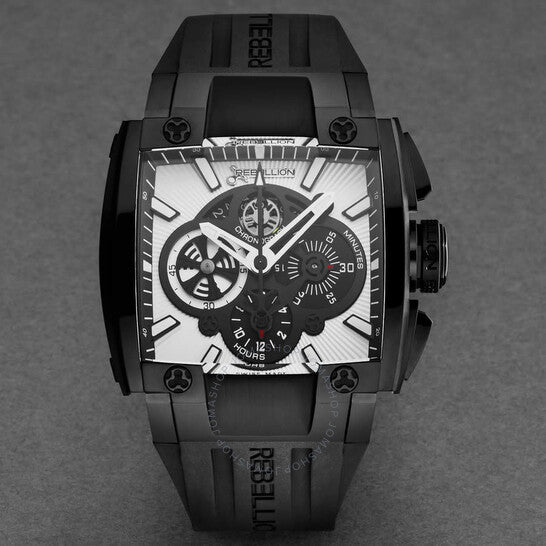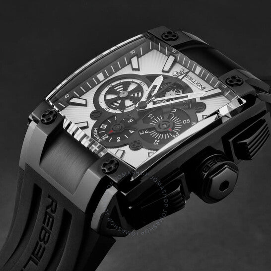 علبة سوداء من الفولاذ المقاوم للصدأ مع سوار مطاطي أسود. إطار ثابت من الفولاذ المقاوم للصدأ أسود. ميناء أبيض بعقارب فضية اللون وعلامات ساعات. علامات دقائق حول الحافة الخارجية. نوع الميناء: تناظري. كرونوغراف - ثلاثة أقراص فرعية تعرض: ٦٠ ثانية، ٣٠ دقيقة، و١٢ ساعة. حركة أوتوماتيكية من عيار كونسيبتو ٠٢١٢١ دي دي. زجاج ياقوتي مقاوم للخدش. تاج قابل للسحب/الدفع. غطاء خلفي شفاف. شكل العلبة مربع، مقاسها: ٤٨ مم، سمكها: ١٩ مم. عرض السوار: ٣٤ مم. مشبك قابل للطي بزر ضغط. مقاومة للماء حتى عمق ١٠٠ متر / ٣٣٠ قدمًا. الوظائف: كرونوغراف، ساعات، دقائق، ثوانٍ. سلسلة Re1. تصميم ساعة فاخرة. علامة الساعة: صناعة سويسرية. ساعة ريبيليون Re1 كرونوغراف أوتوماتيكية للرجال بمينا بيضاء RB.RE1.CH.SB.WH.