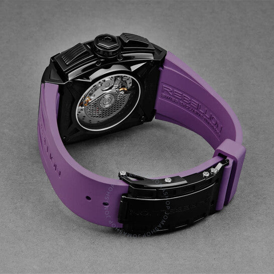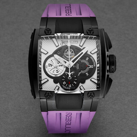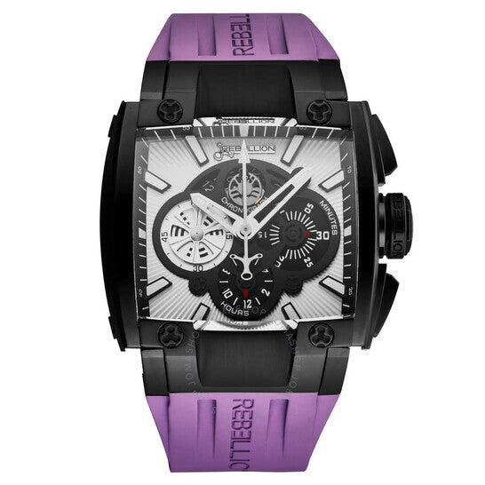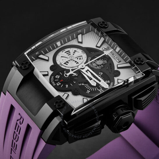 علبة سوداء من الفولاذ المقاوم للصدأ مع سوار مطاطي بنفسجي. إطار ثابت من الفولاذ المقاوم للصدأ أسود. ميناء أبيض بعقارب فضية اللون وعلامات ساعات. علامات دقائق حول الحافة الخارجية. نوع الميناء: تناظري. كرونوغراف - ثلاثة أقراص فرعية تعرض: ٦٠ ثانية، ٣٠ دقيقة، و١٢ ساعة. حركة أوتوماتيكية من عيار كونسيبتو ٠٢١٢١ دي دي. زجاج ياقوت مقاوم للخدش. تاج قابل للسحب/الدفع. غطاء خلفي شفاف. شكل العلبة مربع، مقاسها: ٤٨ مم، سمكها: ١٩ مم. عرض السوار: ٣٤ مم. مشبك قابل للطي بزر ضغط. مقاومة للماء حتى عمق ١٠٠ متر / ٣٣٠ قدمًا. الوظائف: كرونوغراف، ساعات، دقائق، ثوانٍ. سلسلة Re1. تصميم ساعة فاخرة. علامة الساعة: صناعة سويسرية. ساعة ريبيليون Re1 كرونوغراف أوتوماتيكية للرجال بمينا بيضاء RB.RE1.CH.SB.WH1.