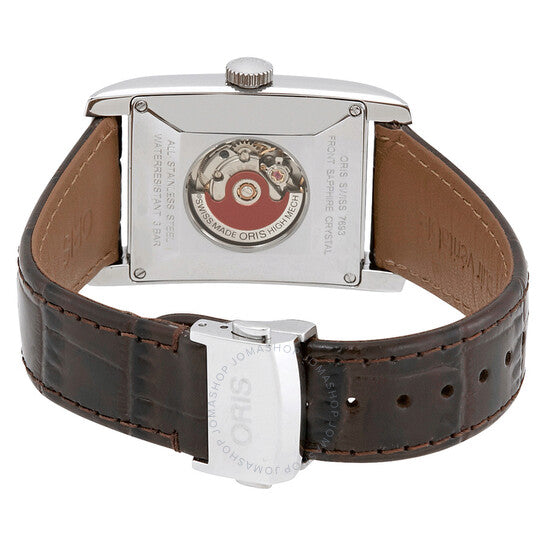 علبة من الفولاذ المقاوم للصدأ مع سوار جلدي بني داكن. إطار ثابت من الفولاذ المقاوم للصدأ فضي اللون. ميناء فضي مع عقارب فضية مضيئة وعلامات ساعات رقمية عربية. علامات دقائق حول حلقة داخلية. نوع الميناء: تناظري. عقارب مضيئة. عرض التاريخ عند موضع الساعة السادسة. أوريس كاليبر 561، قاعدة ETA 2671 حركة أوتوماتيكية، مبنية على ETA 2671، تحتوي على 25 جوهرة، تنبض بمعدل 28800 ذبذبة في الساعة، ولديها احتياطي طاقة لمدة 38 ساعة تقريبًا. كريستال ياقوت مقاوم للخدش. تاج سحب/دفع. غطاء خلفي شفاف. شكل العلبة مستطيل، حجم العلبة: 30 مم × 44 مم، سمك العلبة: 10.7 مم. عرض السوار: 22 مم. مشبك قابل للطي بزر ضغط. مقاومة للماء حتى عمق 30 مترًا / 100 قدم. الوظائف: التاريخ، الساعة، الدقيقة، الثانية. سلسلة مستطيلة. تصميم ساعة كاجوال. ملصق الساعة: صناعة سويسرية. إصدارات المنتج: 561 7693 4061LS، 561.7693.4061LS، 56176934061LS. ساعة أوريس مستطيلة أوتوماتيكية للرجال بمينا فضي، 01 561 7693 4061-07 5 22 20FC.