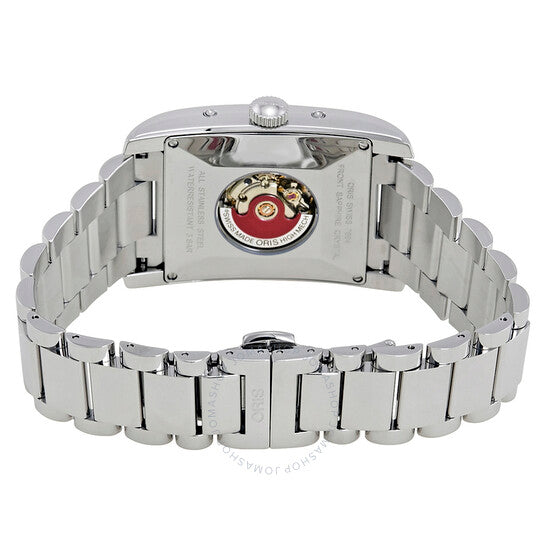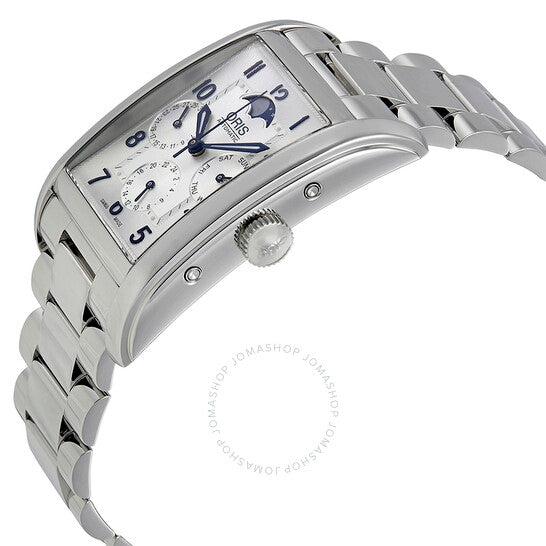 علبة فضية اللون من الفولاذ المقاوم للصدأ مع سوار فضي اللون. إطار ثابت من الفولاذ المقاوم للصدأ فضي اللون. ميناء فضي مع عقارب زرقاء مضيئة وعلامات ساعات عربية. علامات دقائق حول حلقة داخلية. نوع الميناء: تناظري. عقارب مضيئة. ثلاثة: التاريخ، يوم الأسبوع، و٢٤ ساعة. موانئ فرعية لأطوار القمر. عيار أوريس ٥٨٢، حركة أوتوماتيكية أساسية ETA ٢٦٧١ مع احتياطي طاقة ٣٨ ساعة. زجاج ياقوت مقاوم للخدش. غطاء خلفي شفاف. شكل العلبة مستطيل. حجم العلبة: ٤٧ مم × ٣٢ مم. عرض السوار: ٢٤ مم. مشبك قابل للطي. مقاومة للماء حتى عمق ٣٠ مترًا / ١٠٠ قدم. الوظائف: التاريخ، اليوم، الساعة، الدقيقة، الثانية، أطوار القمر. تصميم ساعة كاجوال. علامة الساعة: صناعة سويسرية. ساعة أوريس المستطيلة الأوتوماتيكية للرجال 01 582 7694 4031-07 8 24 20.
