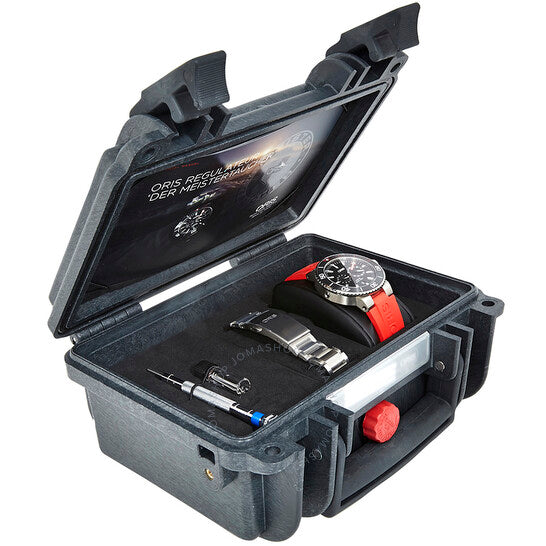 علبة من التيتانيوم مع سوار من التيتانيوم. إطار دوار أحادي الاتجاه من التيتانيوم مع حلقة علوية من السيراميك الأسود. ميناء أسود مع عقارب حمراء وعلامات ساعات مؤشرة. علامات دقائق حول الحافة الخارجية. تُعرض الثواني والساعات على ميناءين فرعيين. نوع الميناء: تناظري. عقارب وعلامات مضيئة. عرض التاريخ عند موضع الساعة السادسة. ميناءان فرعيان - 60 ثانية و12 ساعة. عيار أوريس 749، حركة أوتوماتيكية أساسية SW 220-1 مع احتياطي طاقة لمدة 38 ساعة. زجاج من الياقوت المقاوم للخدش. تاج لولبي. غطاء خلفي صلب. شكل دائري. حجم العلبة: 43.50 مم. عرض السوار: 24 مم. مشبك قابل للطي مع مفتاح أمان. مقاومة للماء حتى عمق 300 متر / 1000 قدم. الوظائف: التاريخ، الساعة، الدقائق، الثواني الصغيرة. طراز ساعة الغوص. علامة الساعة: سويسرية الصنع. ساعة أوريس Regulateur Der Meistertaucher أوتوماتيكية للرجال 01 749 7734 7154-SET.