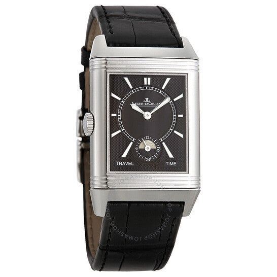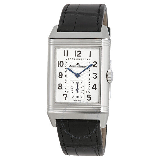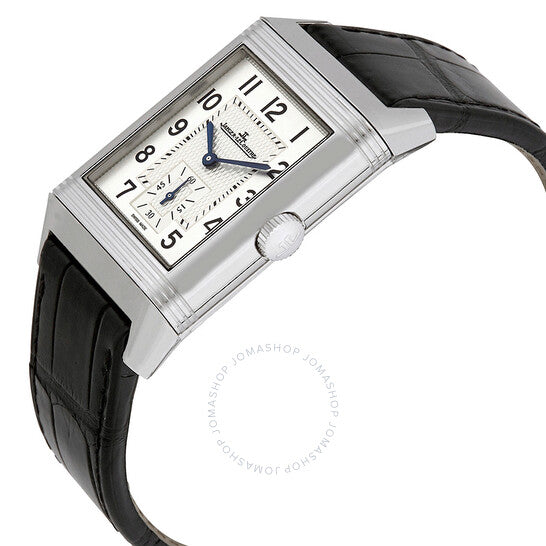 علبة فضية اللون من الفولاذ المقاوم للصدأ مع سوار أسود من جلد التمساح. إطار ثابت من الفولاذ المقاوم للصدأ فضي اللون. ميناء فضي بعقارب زرقاء على شكل سيف وعلامات ساعات عربية سوداء. علامات دقائق حول حلقة داخلية. نوع الميناء: تناظري. ميناء فرعي واحد يعرض: ثانية صغيرة. حركة جيجر لوكولتر كاليبر JLC 854A/2 يدوية التعبئة، تحتوي على 19 جوهرة، مكونة من 160 جزءًا، تنبض بمعدل 21600 ذبذبة في الساعة، ولديها احتياطي طاقة لمدة 42 ساعة تقريبًا. زجاج ياقوتي مقاوم للخدش. تاج قابل للسحب/الدفع. غطاء خلفي صلب. هيكل مستطيل الشكل، مقاسه: 47 مم × 28.3 مم، سمكه: 10.3 مم. عرض السوار: 20 مم. مشبك قابل للطي. مقاومة للماء حتى عمق 30 مترًا / 100 قدم. الوظائف: الساعات، الدقائق، الثواني، المنطقة الزمنية الثانية، عرض 24 ساعة. سلسلة ريفيرسو كلاسيك دوفاس. ساعة رسمية. علامة الساعة: صناعة سويسرية. ساعة جيجر لوكولتر ريفيرسو كلاسيك دوفاس يدوية للرجال، طراز Q3848420.