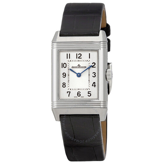 علبة فضية اللون من الفولاذ المقاوم للصدأ مع سوار جلدي أسود. إطار ثابت فضي اللون من الفولاذ المقاوم للصدأ. ميناء فضي بعقارب زرقاء على شكل سيف وعلامات ساعات رقمية عربية سوداء. مقياس دقائق حول الحافة الداخلية. نوع الميناء: تناظري. حركة جيجر لوكولتر كاليبر JLC 846/1 يدوية التعبئة، تحتوي على 17 جوهرة، مكونة من 93 جزءًا، تنبض بمعدل 21600 ذبذبة في الساعة، ولديها احتياطي طاقة لمدة 40 ساعة تقريبًا. زجاج من الياقوت المقاوم للخدش. تاج قابل للسحب/الدفع. غطاء خلفي صلب. شكل العلبة مستطيل، مقاسها: 34.2 مم × 21 مم. مشبك بإبزيم. مقاومة للماء حتى عمق 30 مترًا / 100 قدم. الوظائف: الساعة، الدقائق. سلسلة ريفيرسو الكلاسيكية. طراز ساعة فاخرة. علامة الساعة: صناعة سويسرية. ساعة جيجر لوكولتر ريفيرسو الكلاسيكية النسائية بمينا فضي وجلد Q2608530.