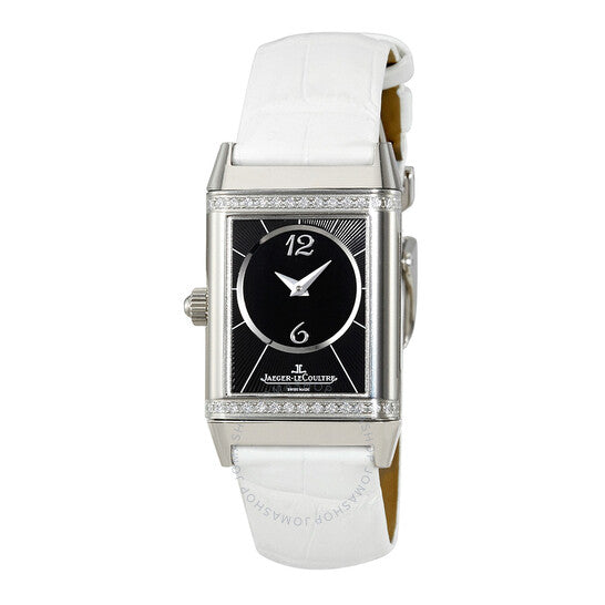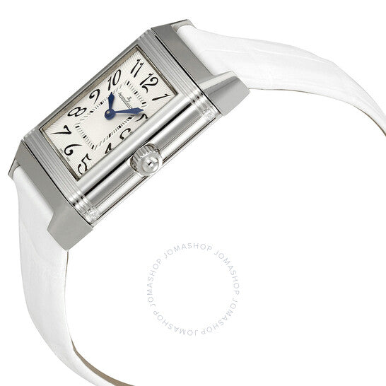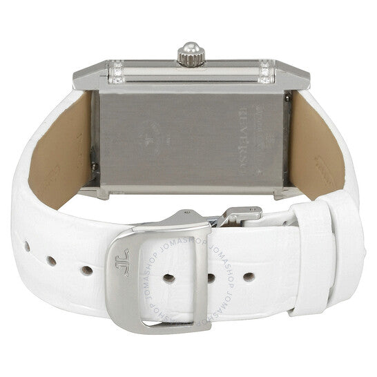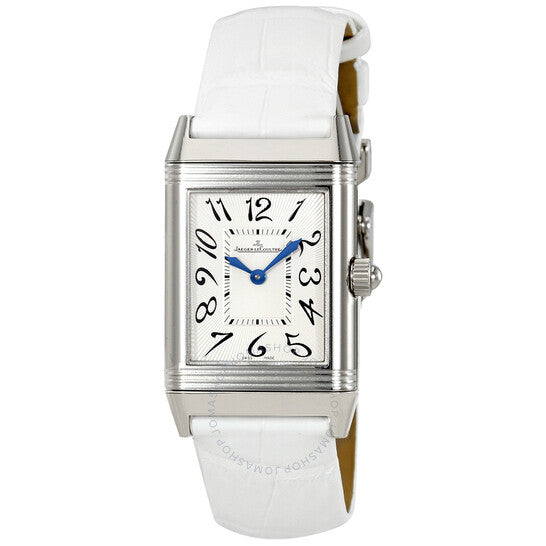 علبة فضية اللون من الفولاذ المقاوم للصدأ مع سوار جلدي أبيض. إطار ثابت فضي اللون من الفولاذ المقاوم للصدأ. ميناء أسود وفضي مع عقارب زرقاء على شكل سيف وعلامات ساعات عربية سوداء. علامات دقائق حول حلقة داخلية. نوع الميناء: تناظري. حركة جيجر لوكولتر كاليبر JLC 865 يدوية التعبئة، تحتوي على 19 جوهرة، تنبض بمعدل 21600 ذبذبة في الساعة، ولديها احتياطي طاقة لمدة 48 ساعة تقريبًا. زجاج ياقوتي مقاوم للخدش. علبة مستطيلة الشكل، مقاسها: 38 مم × 23 مم، سمكها: 9.5 مم. مشبك قابل للطي. مقاومة للماء حتى عمق 30 مترًا / 100 قدم. الوظائف: الساعة، الدقائق. سلسلة ريفيرسو دويتو كلاسيك. تصميم ساعة فاخرة. علامة الساعة: صناعة سويسرية. إصدارات الساعة: Q2568402، 2568402، 256.84.02، Q256.84.02. ساعة جايجر لوكولتر ريفيرسو دويتو ذات الميناء الأسود للسيدات Q2568402.