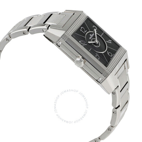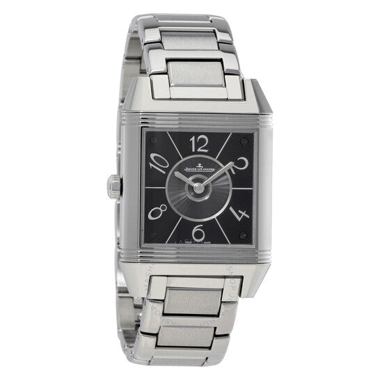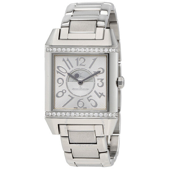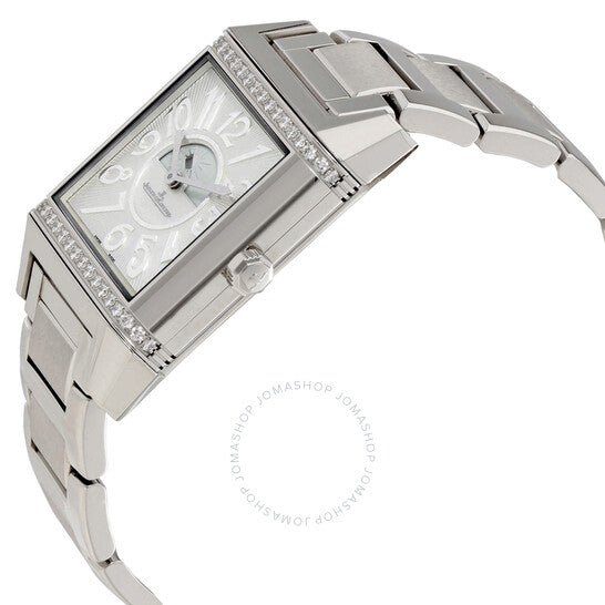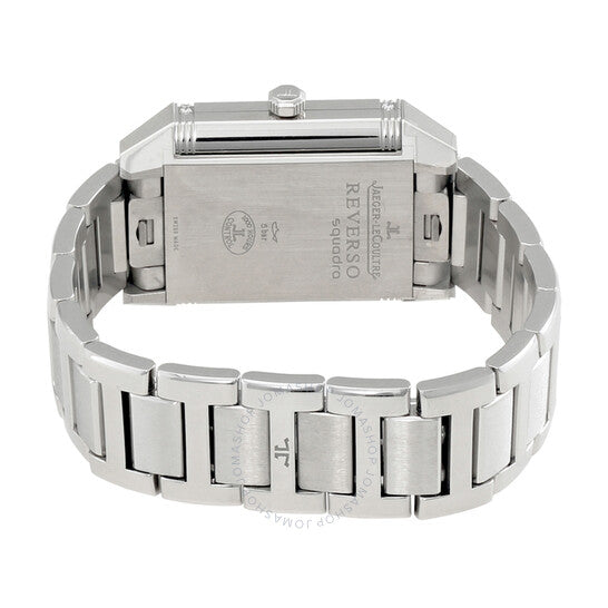 علبة من الفولاذ المقاوم للصدأ فضية اللون مع سوار فضي اللون. إطار ثابت مرصع بالألماس فضي اللون. ميناء فضي مزخرف بنقش غيوشيه مع عقارب فضية اللون وعلامات ساعات بأرقام عربية وعلامات دقائق. نوع الميناء: تناظري. حركة أوتوماتيكية من طراز جيجر لوكولتر كاليبر JLC 968، تحتوي على 28 جوهرة، مكونة من 207 أجزاء، تنبض بمعدل 28800 ذبذبة في الساعة، وتحتفظ باحتياطي طاقة يدوم حوالي 38 ساعة. زجاج ياقوتي مقاوم للخدش. غطاء خلفي صلب. هيكل مستطيل الشكل، أبعاده: 42 مم × 28.8 مم. مشبك قابل للطي بزر ضغط. مقاومة للماء حتى عمق 30 مترًا / 100 قدم. الوظائف: الساعات، الدقائق، مؤشر الليل/النهار. سلسلة ريفيرسو سكوادرا. تصميم ساعة فاخرة. علامة الساعة: صناعة سويسرية. إصدارات المنتج: 7058130، 7058130، 705.81.30، Q705.81.30. ساعة جيجر لوكولتر ريفيرسو سكوادرا النسائية، بمينا فضي مزخرف بنقش غيوشيه، Q7058130.
