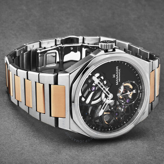 علبة فضية اللون من الفولاذ المقاوم للصدأ مع سوار ثنائي اللون من الفولاذ المقاوم للصدأ. إطار ثابت فضي اللون من الفولاذ المقاوم للصدأ. ميناء أسود بعقارب وعلامات ساعات فضية اللون. علامات دقائق حول الحافة الخارجية. نوع الميناء: تناظري. عقارب وعلامات مضيئة. آلية تعبئة يدوية. زجاج ياقوت مقاوم للخدش. تاج قابل للسحب/الدفع. غطاء خلفي شفاف. شكل دائري، مقاس العلبة: 44 مم، سمكها: 11 مم. عرض السوار: 26 مم، طوله: 8 بوصات. مشبك قابل للطي بزر ضغط. مقاومة للماء حتى عمق 50 مترًا / 165 قدمًا. الوظائف: الساعات، الدقائق، الثواني. معلومات إضافية: الساعات، الدقائق، والثواني الصغيرة. سلسلة ريفولوشن. تصميم ساعة فاخرة. علامة الساعة: صناعة سويسرية. ساعة مانجر ريفولوشن للرجال بمينا أسود ووظيفة التعبئة اليدوية MAN-RM-06-BM.