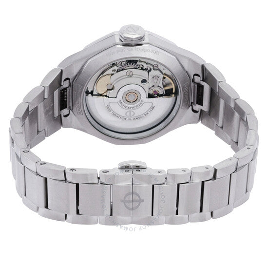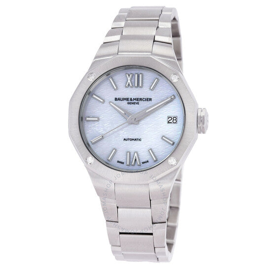 علبة وسوار من الفولاذ المقاوم للصدأ فضي اللون. إطار ثابت فضي اللون مرصع بالألماس من الفولاذ المقاوم للصدأ. ميناء من عرق اللؤلؤ مع عقارب فضية اللون وعلامات ساعات رومانية ومؤشرية. نوع الميناء: تناظري. عرض التاريخ عند موضع الساعة 3. حركة أوتوماتيكية من سيليتا كاليبر SW200، تحتوي على 26 جوهرة، تنبض بمعدل 28800 ذبذبة في الساعة، ولديها احتياطي طاقة يدوم حوالي 38 ساعة. كريستال ياقوت مقاوم للخدش. غطاء خلفي شفاف. شكل العلبة اثنا عشري الأضلاع، مقاسها 33 مم. مشبك قابل للطي. مقاومة للماء حتى عمق 50 مترًا / 165 قدمًا. الوظائف: التاريخ، الساعة، الدقيقة، الثانية. سلسلة ريفييرا. تصميم كاجوال. علامة الساعة: صناعة سويسرية. ساعة بوم إيه ميرسييه ريفييرا أوتوماتيكية نسائية مرصعة بالألماس M0A10676.