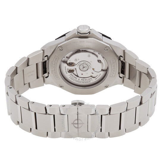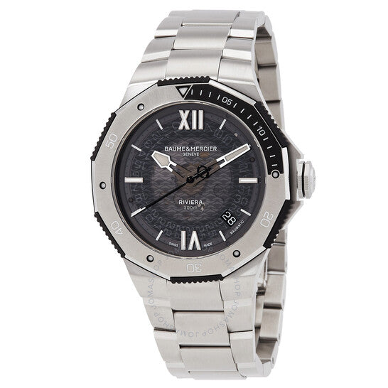 علبة وسوار من الفولاذ المقاوم للصدأ فضي اللون. إطار دوار أحادي الاتجاه من الفولاذ المقاوم للصدأ فضي اللون. ميناء رمادي اللون مع عقارب فضية اللون وعلامات ساعات رومانية ومؤشرية. نوع الميناء: تناظري. عقارب وعلامات مضيئة. عرض التاريخ بين موضعي الساعة 4 و5. آلية حركة أوتوماتيكية. زجاج ياقوت مقاوم للخدش. تاج لولبي. شكل العلبة دائري، مقاسها: 42 مم. مشبك قابل للطي مع مفتاح أمان. مقاومة للماء حتى عمق 300 متر / 1000 قدم. الوظائف: التاريخ، الساعة، الدقيقة، الثانية. سلسلة ريفييرا. طراز ساعة الغوص. علامة الساعة: صناعة سويسرية. إصدارات المنتج: MOA10717، 10717. ساعة بوم إيه ميرسييه ريفييرا أوتوماتيكية للرجال بمينا رمادي، M0A10717.