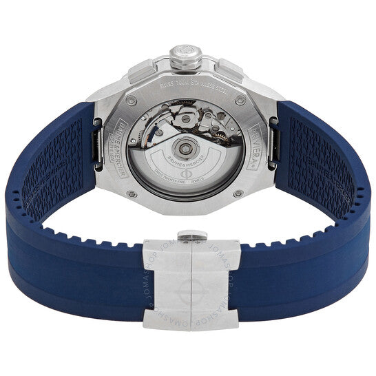 علبة من الفولاذ المقاوم للصدأ مع سوار مطاطي أزرق. إطار ثابت من الفولاذ المقاوم للصدأ. ميناء أزرق مع عقارب ومؤشرات ساعات فضية مضيئة. يظهر الرقم الروماني عند موضع الساعة ١٢. علامات الدقائق حول الحافة الخارجية. نوع الميناء: تناظري. عقارب ومؤشرات مضيئة. عرض يوم الأسبوع والتاريخ عند موضع الساعة ٣. كرونوغراف - ثلاثة موانئ فرعية تعرض: ٦٠ ثانية، ٣٠ دقيقة، و١٢ ساعة. حركة أوتوماتيكية من عيار فالجو ٧٧٥٠ مع احتياطي طاقة ٤٨ ساعة. زجاج ياقوت مقاوم للخدش. تاج لولبي. غطاء خلفي شفاف. شكل هيكل دوديكاغون. حجم الهيكل: ٤٣ مم. سمك الهيكل: ١٤ مم. مشبك قابل للطي بزر ضغط. مقاومة للماء حتى عمق ١٠٠ متر / ٣٣٠ قدمًا. الوظائف: كرونوغراف، يوم، تاريخ، ساعة، دقيقة، ثانية. سلسلة ريفييرا. طراز ساعة رياضية. ملصق الساعة: صناعة سويسرية. ساعة بوم ايه ميرسييه ريفييرا كرونوغراف أوتوماتيكية بمينا أزرق للرجال M0A10623.