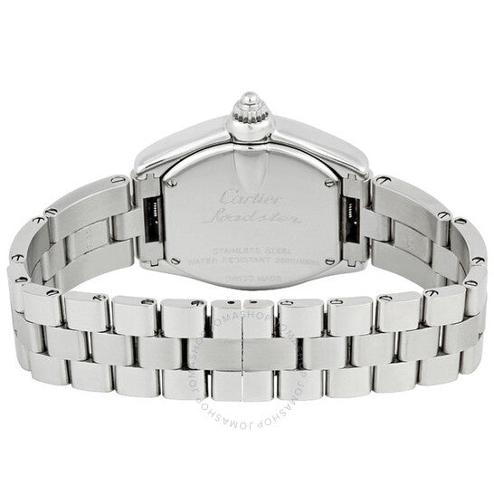 علبة من الفولاذ المقاوم للصدأ مع سوار من الفولاذ المقاوم للصدأ. ميناء أزرق فاتح وأبيض بعقارب مضيئة وعلامات ساعات بأرقام رومانية. يعرض التاريخ عند موضع الساعة 3. زجاج من الياقوت المقاوم للخدش. آلية حركة كوارتز. قطر العلبة 30 مم. سُمكها 9 مم. مشبك قابل للطي. مقاومة للماء حتى عمق 100 متر (330 قدمًا). ساعة كارتييه رودستر النسائية W62053V3