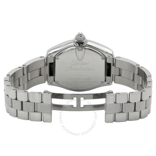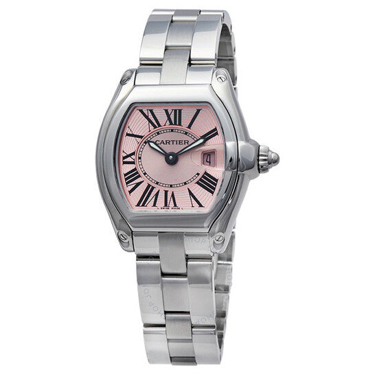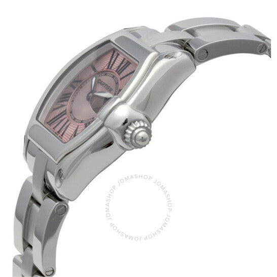 علبة من الفولاذ المقاوم للصدأ مع سوار من الفولاذ المقاوم للصدأ. إطار ثابت من الفولاذ المقاوم للصدأ. ميناء وردي بعقارب مضيئة وعلامات ساعات رومانية سوداء. علامات دقائق حول حلقة داخلية. نافذة لعرض التاريخ عند موضع الساعة 3. آلية حركة كوارتز. زجاج ياقوت مقاوم للخدش. تاج لولبي. غطاء خلفي صلب. أبعاد العلبة: 36 مم × 30 مم. سُمكها: 9.0 مم. مشبك قابل للطي مخفي. مقاومة للماء حتى عمق 100 متر / 330 قدمًا. الوظائف: الساعات، الدقائق، التاريخ. معلومات إضافية: تتضمن سوارًا قماشيًا عنابيًا قابلًا للتبديل. ساعة كارتييه رودستر وردية نسائية W62017V3.