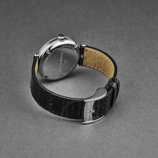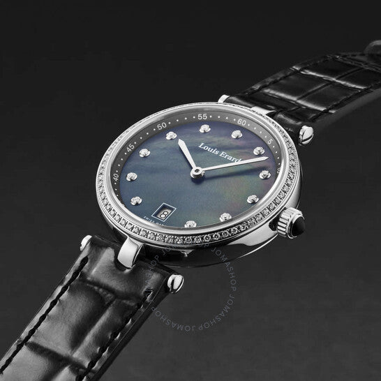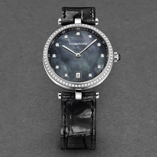 علبة من الفولاذ المقاوم للصدأ فضية اللون مع سوار جلدي أسود. إطار ثابت من الفولاذ المقاوم للصدأ فضي اللون. ميناء أسود بعقارب فضية اللون وعلامات ساعات من الألماس. نوع الميناء: تناظري. عرض التاريخ عند موضع الساعة السادسة. آلية حركة كوارتز. زجاج ياقوت مقاوم للخدش. تاج قابل للسحب/الدفع. غطاء خلفي صلب. شكل دائري، مقاس العلبة: 33 مم، سمكها: 8.6 مم. عرض السوار: 16 مم، طوله: 7 بوصات. مشبك تانغ. مقاومة للماء حتى عمق 50 مترًا / 165 قدمًا. الوظائف: التاريخ، الساعة، الدقائق. معلومات إضافية: الساعات، الدقائق، التاريخ. سلسلة رومانس. طراز ساعة فاخرة. علامة الساعة: صناعة سويسرية. ساعة لويس إيرارد رومانس كوارتز نسائية بمينا سوداء مرصعة بالألماس، 11810SE19.BDCB7.