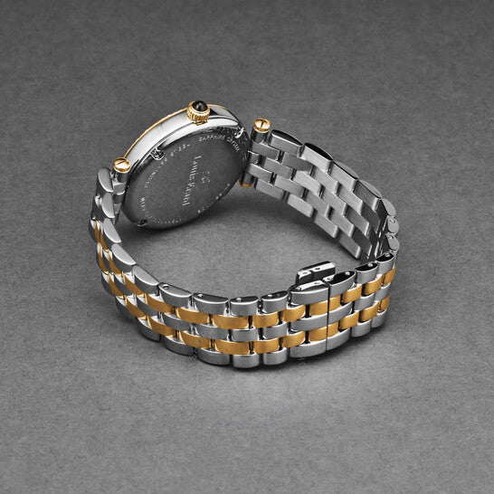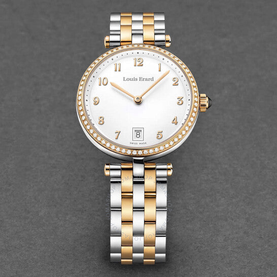 علبة من الفولاذ المقاوم للصدأ بسوار من الفولاذ المقاوم للصدأ ثنائي اللون (فضي وذهبي وردي). إطار ثابت من الفولاذ المقاوم للصدأ بلون ذهبي وردي. ميناء أبيض بعقارب بلون ذهبي وردي وعلامات ساعات رقمية عربية. نوع الميناء: تناظري. عرض التاريخ عند موضع الساعة السادسة. آلية حركة كوارتز. زجاج ياقوت مقاوم للخدش. تاج قابل للسحب/الدفع. غطاء خلفي صلب. شكل دائري، مقاس العلبة: 33 مم، سمكها: 8.6 مم. عرض السوار: 16 مم، طوله: 7 بوصات. مشبك قابل للطي بزر ضغط. مقاومة للماء حتى عمق 50 مترًا / 165 قدمًا. الوظائف: التاريخ، الساعة، الدقائق. معلومات إضافية: الساعات، الدقائق، التاريخ. سلسلة رومانس. تصميم ساعة فاخرة. علامة الساعة: صناعة سويسرية. ساعة لويس إيرارد رومانس كوارتز نسائية بمينا بيضاء، 11810SB40.BMA27.