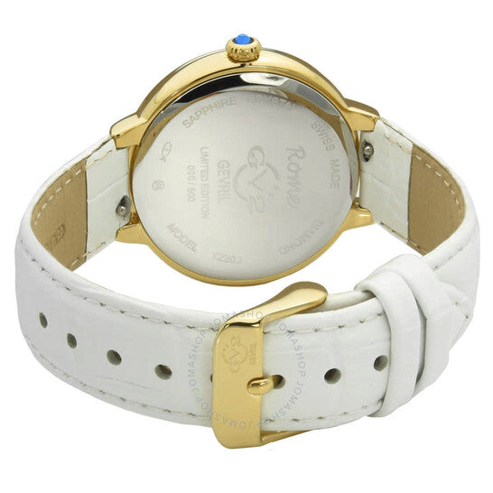 علبة من الفولاذ المقاوم للصدأ بلون ذهبي مع سوار من جلد العجل الأبيض. إطار ثابت من الفولاذ المقاوم للصدأ بلون ذهبي. ميناء أبيض بعقارب زرقاء وعلامات ساعات رومانية. علامات دقائق حول الحافة الخارجية. نوع الميناء: تناظري. ميناء فرعي للثواني الصغيرة. حركة كوارتز سويسرية روندا 1069. زجاج من الياقوت المقاوم للخدش. تاج قابل للسحب/الدفع. غطاء خلفي صلب. شكل دائري، مقاس العلبة: 36 مم، سمكها: 13 مم. عرض السوار: 16 مم. مشبك قابل للطي بزر ضغط. مقاومة للماء حتى عمق 30 مترًا / 100 قدم. وظائف الساعة: الساعة، الدقيقة، الثانية. تصميم عصري. ساعة GV2 من جيفريل روم كوارتز نسائية بمينا بيضاء 12202.