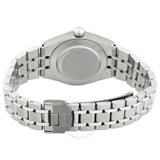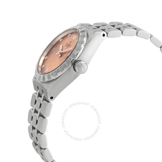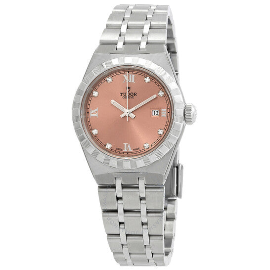 علبة وسوار من الفولاذ المقاوم للصدأ بلون فضي. إطار ثابت من الفولاذ المقاوم للصدأ بلون فضي. ميناء بلون السلمون مع عقارب فضية وعلامات ساعات من الماس. أرقام رومانية تُشير إلى مواقع الساعات 3 و6 و9 و12. علامات دقائق حول الحافة الخارجية. نوع الميناء: تناظري. عقارب مضيئة. نافذة عرض التاريخ عند موضع الساعة 3. حركة أوتوماتيكية من طراز تيودور كاليبر T201، مبنية على معيار ETA 2671، تحتوي على 25 جوهرة، تنبض بمعدل 28800 ذبذبة في الساعة، ولديها احتياطي طاقة يدوم حوالي 38 ساعة. زجاج من الياقوت المقاوم للخدش. تاج لولبي. غطاء خلفي صلب. شكل العلبة دائري، مقاسها 28 مم. مشبك قابل للطي مع مفتاح أمان. مقاومة للماء حتى عمق 100 متر / 330 قدمًا. الوظائف: التاريخ، الساعة، الدقيقة، الثانية. سلسلة رويال. تصميم ساعة فاخرة. علامة الساعة: صناعة سويسرية. ساعة تيودور رويال أوتوماتيكية مرصعة بالألماس ومينا سمك السلمون للسيدات M28300-0010.