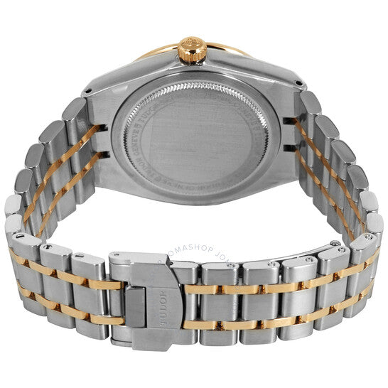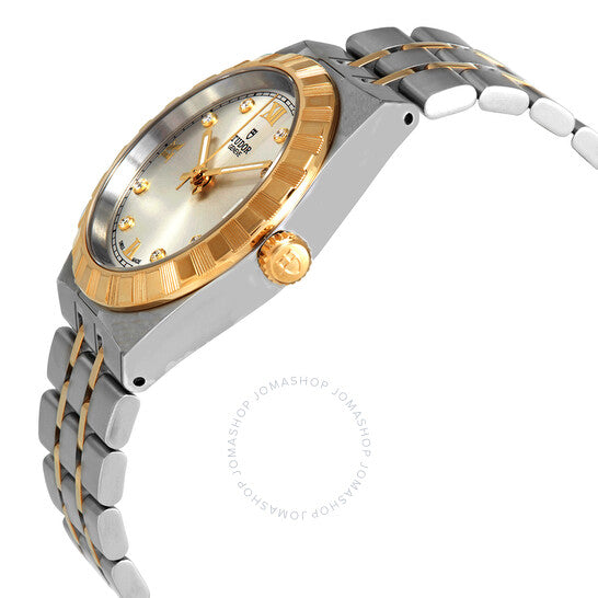 علبة من الفولاذ المقاوم للصدأ فضية اللون، مع سوار من الفولاذ المقاوم للصدأ فضي اللون، بوصلات من الذهب الأصفر عيار 18 قيراطًا. إطار ثابت من الذهب الأصفر عيار 18 قيراطًا. ميناء فضي مع عقارب مضيئة من الذهب الأصفر وعلامات ساعات من الماس. تظهر الأرقام الرومانية عند الساعة 3، 6، 9، و12. علامات الدقائق حول الحافة الخارجية. نوع الميناء: تناظري. عرض التاريخ عند الساعة 3. حركة أوتوماتيكية من طراز تيودور كاليبر T601، مبنية على ETA 2824، تحتوي على 25 جوهرة، تنبض بمعدل 28800 ذبذبة في الساعة، ولديها احتياطي طاقة لمدة 38 ساعة تقريبًا. زجاج من الياقوت المقاوم للخدش. تاج لولبي. غطاء خلفي صلب. شكل دائري، حجم العلبة: 34 مم. مشبك قابل للطي. مقاومة للماء حتى عمق 100 متر / 330 قدمًا. الوظائف: التاريخ، الساعة، الدقيقة، الثانية. سلسلة رويال. طراز ساعة رسمية. علامة الساعة: صناعة سويسرية. ساعة Tudor Royal Automatic Diamond Silver Dial 34 mm M28403-0002.