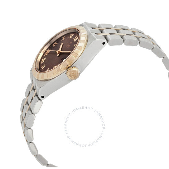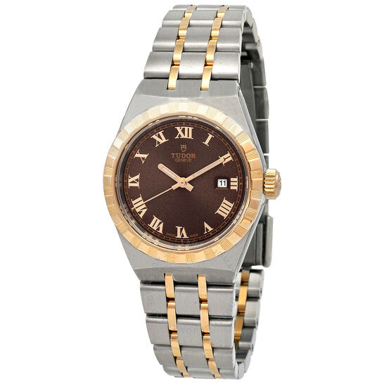 علبة من الذهب الأصفر عيار ١٨ قيراطًا، مع سوار من الفولاذ المقاوم للصدأ والذهب الأصفر عيار ١٨ قيراطًا. إطار ثابت من الذهب الأصفر عيار ١٨ قيراطًا. ميناء بني شوكولاتة مع عقارب من الذهب الأصفر عيار ١٨ قيراطًا وعلامات ساعات بأرقام رومانية. علامات دقائق حول الحافة الخارجية. نوع الميناء: تناظري. عرض التاريخ عند موضع الساعة ٣. حركة أوتوماتيكية من طراز تيودور كاليبر T201، مبنية على معيار ETA ٢٦٧١، تحتوي على ٢٥ جوهرة، تنبض بتردد ٢٨٨٠٠ ذبذبة في الساعة، وتحتفظ باحتياطي طاقة يدوم حوالي ٣٨ ساعة. زجاج ياقوت مقاوم للخدش. غطاء خلفي صلب. شكل العلبة دائري، مقاسها ٢٨ مم. مقاومة للماء حتى عمق ١٠٠ متر / ٣٣٠ قدمًا. الوظائف: التاريخ، الساعة، الدقيقة، الثانية. سلسلة رويال. طراز ساعة رسمية. علامة الساعة: صناعة سويسرية. ساعة تيودور رويال أوتوماتيكية نسائية M28303-0008.