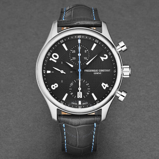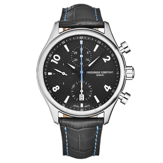 علبة فضية اللون من الفولاذ المقاوم للصدأ مع سوار جلدي أسود/أزرق. إطار ثابت من الفولاذ المقاوم للصدأ فضي اللون. ميناء أسود بعقارب فضية اللون وأرقام عربية/مؤشرات للساعات. علامات دقائق حول الحافة الخارجية. نوع الميناء: تناظري. عقارب مضيئة. عرض التاريخ عند موضع الساعة السادسة. كرونوغراف - أقراص فرعية تعرض: ١٢ ساعة، ٣٠ دقيقة، ٦٠ ثانية. حركة أوتوماتيكية من عيار فريدريك كونستانت FC-392، مبنية على ETA 7750، تحتوي على ٢٥ جوهرة، تنبض بتردد ٢٨٨٠٠ ذبذبة في الساعة، ولديها احتياطي طاقة لمدة ٤٢ ساعة تقريبًا. زجاج ياقوت مقاوم للخدش. تاج لولبي. غطاء خلفي شفاف. شكل دائري، حجم العلبة: ٤٢ مم، سمكها: ١٤.٥٠ مم. مشبك قابل للطي. مقاومة للماء حتى عمق ٥٠ مترًا / ١٦٥ قدمًا. الوظائف: كرونوغراف، تاريخ، ساعة، دقيقة، ثانية. سلسلة ران أباوت. ساعة رياضية. علامة الساعة: صناعة سويسرية. ساعة فريدريك كونستانت ران أباوت أوتوماتيكية للرجال بمينا أسود، FC-392RMG5B6.
